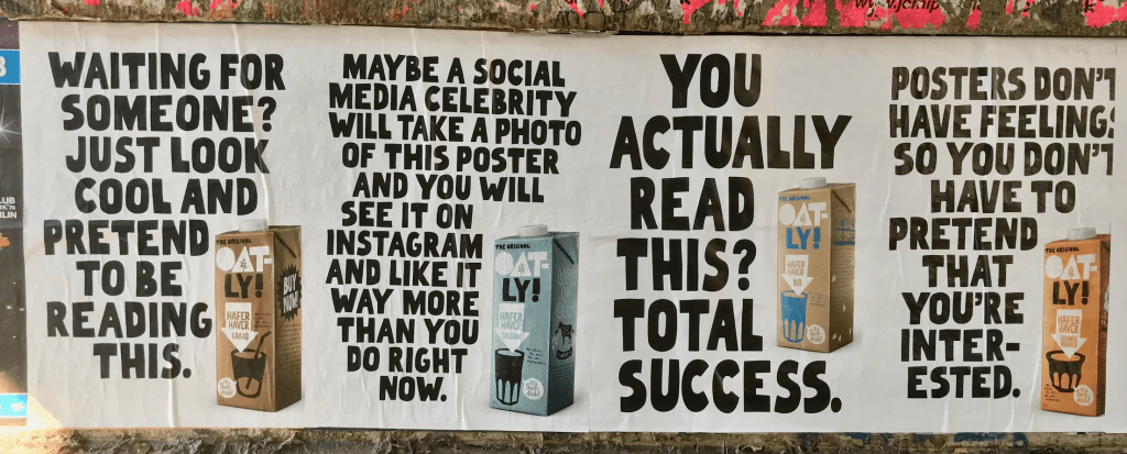 Now one last self-referential ad that I think worked well, Oatly milk’s recent OOH campaign. While some of them I think are a little condescending on the whole I think they walk the line while keeping their humor. They definitely made me stop and read them as well as remember them. I now associate the ad with the milk when I see it in the shops and think that’s the Milk from those ads.