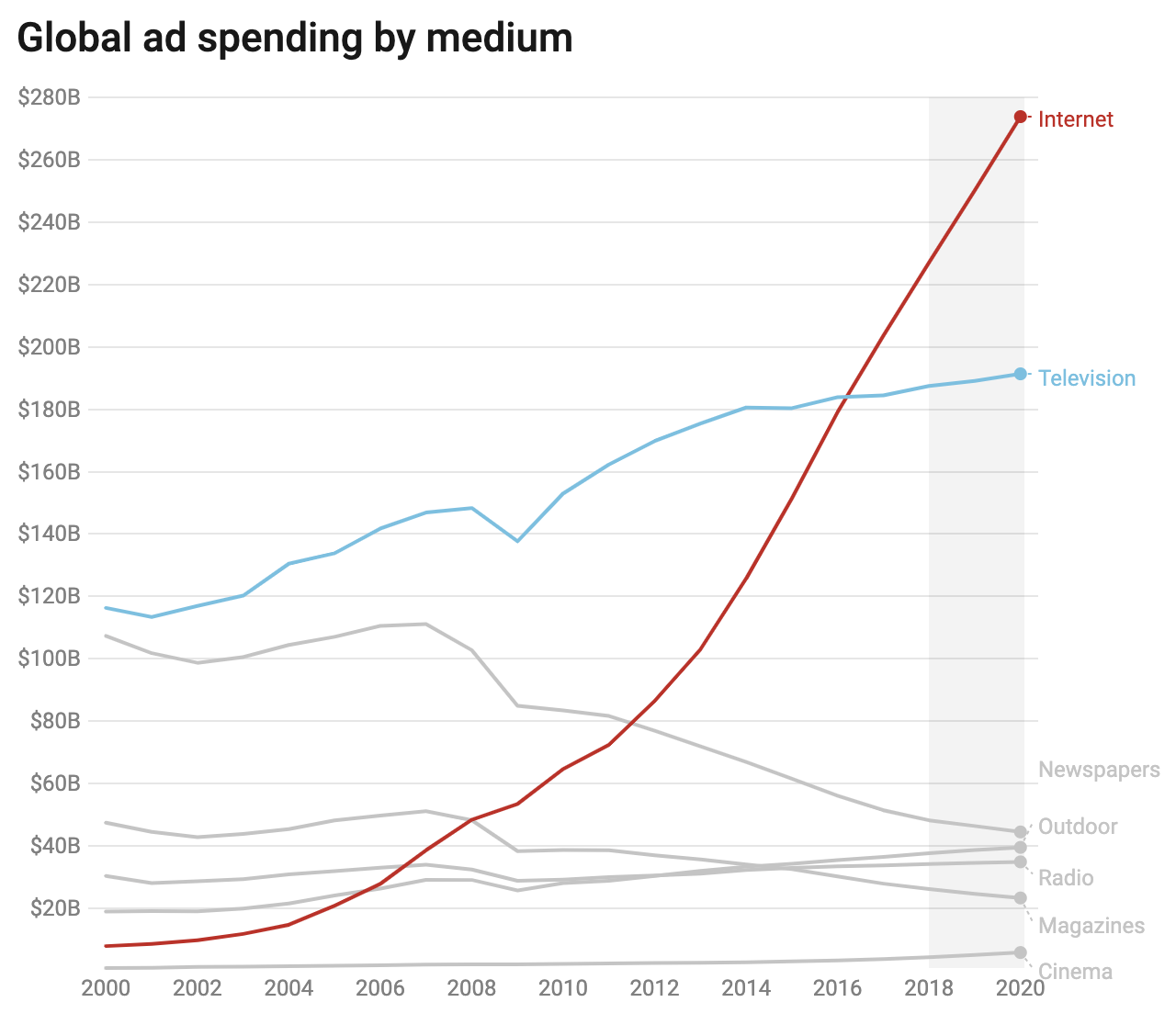 In 2018 an article released by Vox stated ‘Online advertisers are expected to outspend TV advertisers by $40 billion this year.’ saying that 40% of the world’s ad spending is spent online. It is expected that TV advertisements will make up less than a third of all advertising budgets by the end of 2021.